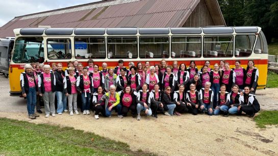 Nach einer erstaunlich erholsamen Nacht stossen am Morgen die Sonntagsfrauen im Oldtimer-Postauto 🚌 zu uns – Landfrauen-Feeling inklusive. Alle tragen stolz unser pinkes Chilbi-Shirt 💝 mit dem Aufdruck «Eg ha di gärn».